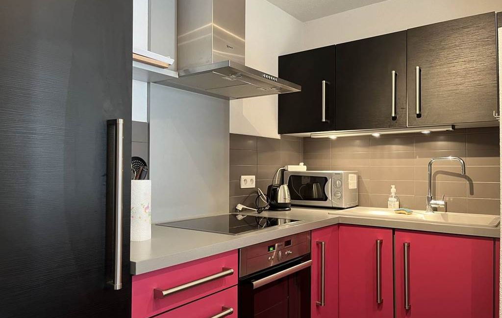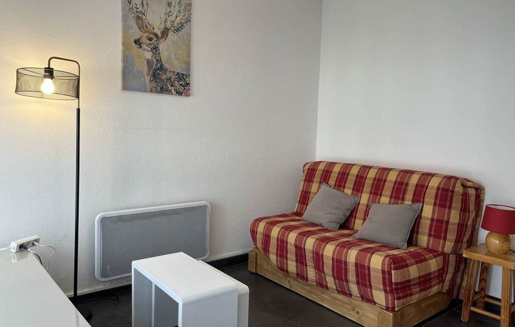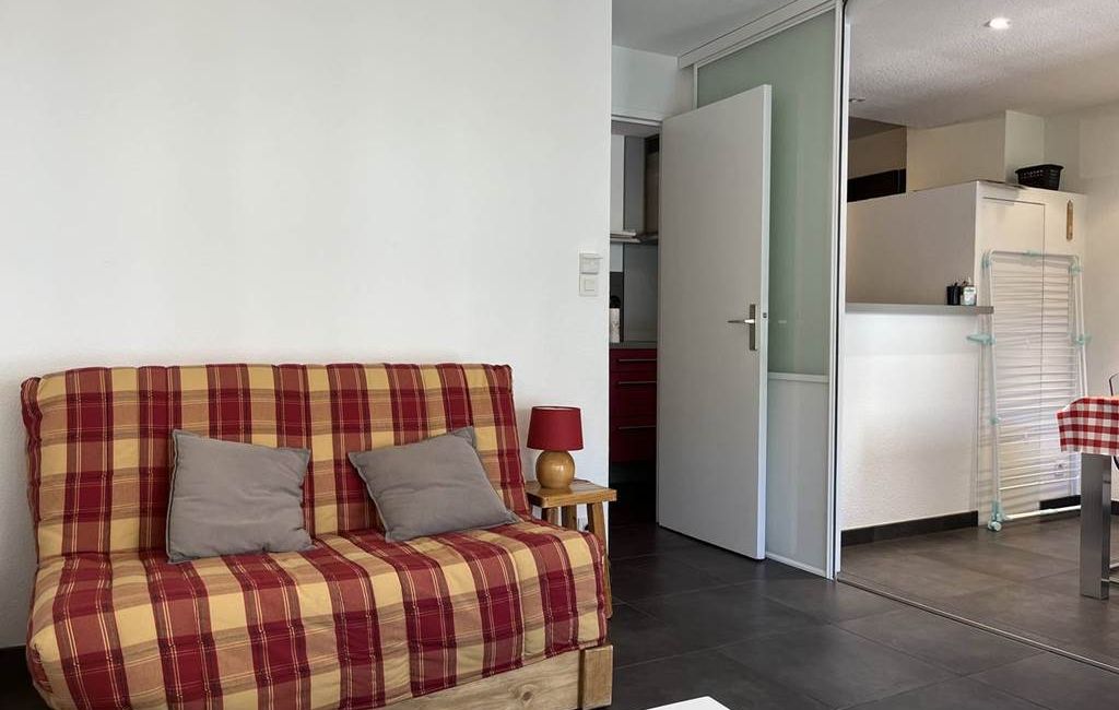 La cuisine, séparée de la pièce de vie par un petit bar, s'ouvre sur un salon avec canapé convertible et donnant accès au balcon.